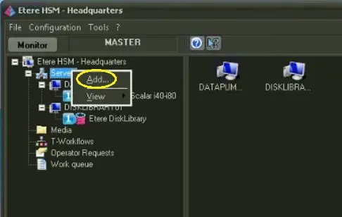 From the workstation where HSM Headquarters is installed, right-click on Server and select "Add" function to establish connection to the newly configured HSM Disk Library.
