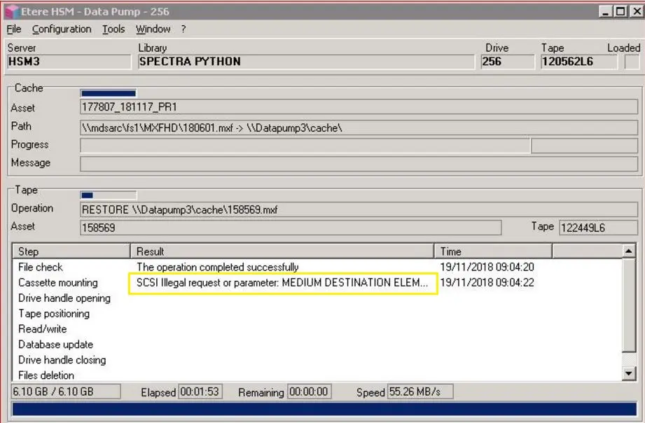 In Etere version 25, SCSI error “MEDIUM DESTINATION ELEMENT FULL” encountered in Data Pump when mounting and dismounting tapes from Spectra Python tape library. The error persistent after restarted Spectra Python Tape Library, HSM Headquarters, and Data Pump.