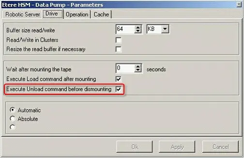 In the event if Etere’s SCSI commands does not include the “dismount” command, the tape exchange would failed. By enabling the “Library-Assisted Drive Unload” option to keep the Library default settings should the scenario occurred.