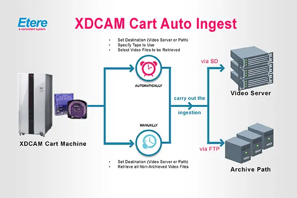 This module allows you to retrieve video files from professional XDCAM discs to video servers or storage paths. The overall functioning of this modulo is illustrated in the figure below: