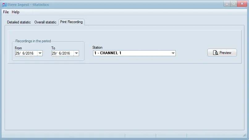 Allows printing of statistic records within a specific date range from Etere client PC: