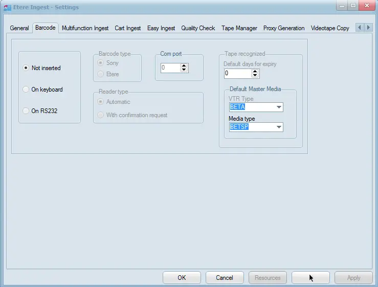 •Set the barcode type to be used, you can select between either a Sony barcode reader or the Etere defined in Etere Configuration | Settings | Barcode,