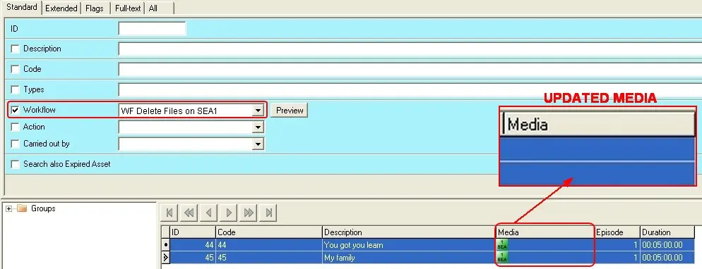 This feature is useful if, for example, you want to carry out a batch deletion of video files linked to a group of assets. The image below illustrates how the 'Media' (section that indicates to which video files the asset form is linked) of a certain group of assets have been updated after that a 'File Deletion' action has been performed via T-workflow: