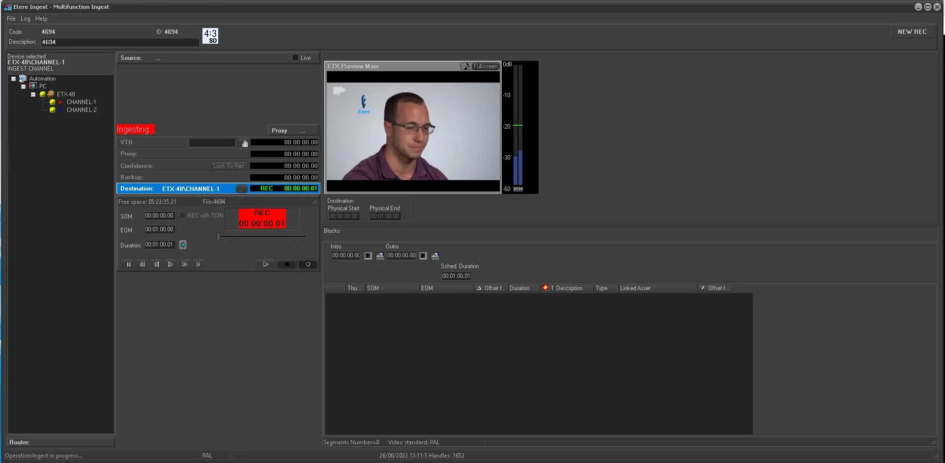 Once all devices have been correctly selected, in order to start ingesting the asset media, just point out ingest panel and press the -now active- [REC_Multi_XDCAM06 Recording] button, if a preview resource is configured, the video file will be loaded automatically; at this point, it will be required to wait for the ingest process to finish.