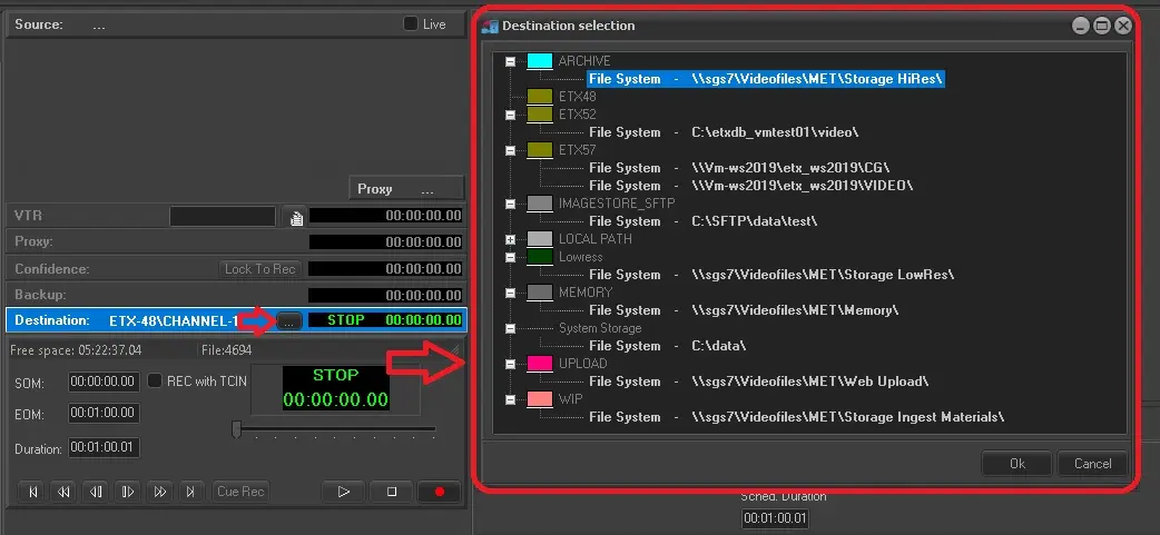 Once a recording start, drag and drop a decoder into the confidence panel to enable this feature. Once enabled, the confidence counter will be displayed in the destination, where, it will be possible to get the start timecode (double-click the SOM or Mark-in) as well as to move back and forth across the video using playback buttons.