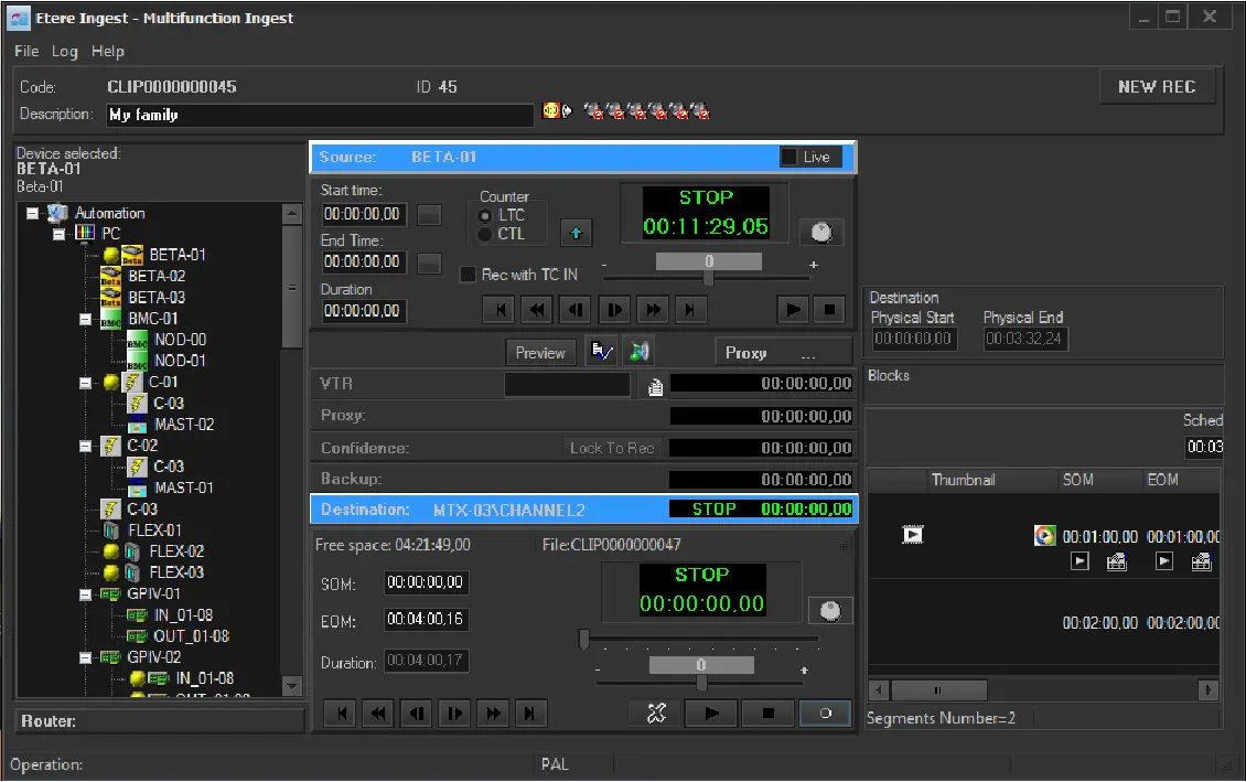 When the ingest ends, decoders configured for preview will be used to play the just ingested media clip, in this way the operator will be allowed to quickly check the quality and trim of the clip.