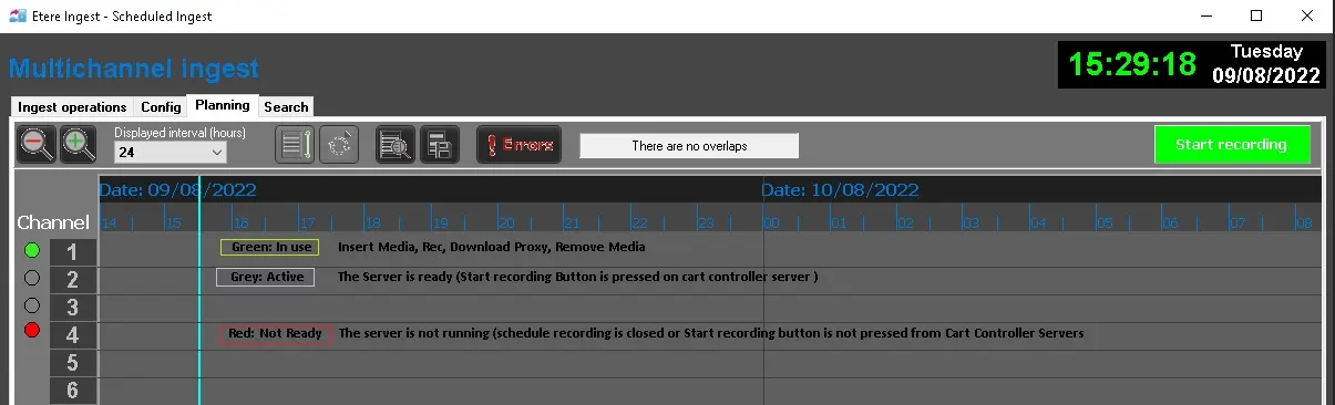 Monitoring the ingest process: In the planning tab, the status of each ingest operation can be identified by a colored circle beside the channel number: