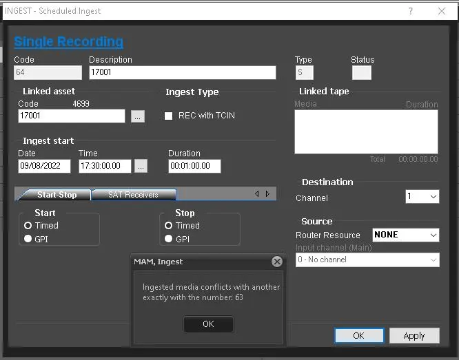 Conflicting Operations: If an ingest operation is followed by a second scheduled ingest operation in the same deck but with a start time too close to the end of the previous scheduled operation an error message will appear: