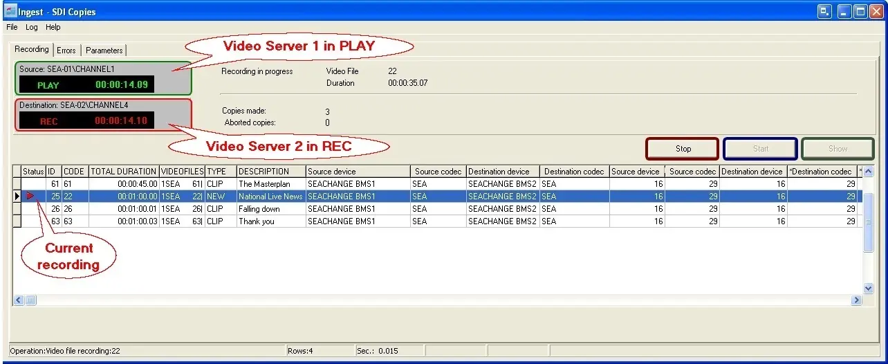This module allows the copy of video files from one Video Server to another using a Serial Digital Interface (SDI) which permits to partially view on the destination video Server the video file that is currently being copied. Actually, this module act as a 'SDI Copy Server', it means that in order to carry out all the SDI copies assigned via T-workflow to specific assets, this module must be launched and started, in this way it will automatically monitor all pending SDI copies.