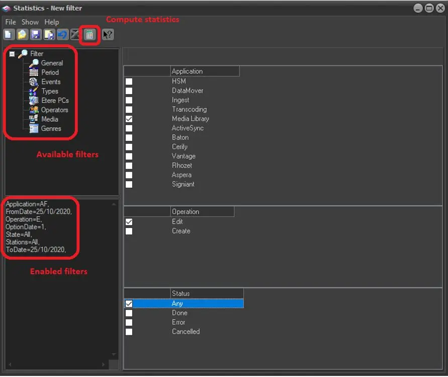 General - Here, you MUST select the Etere application to which statistics are related, optionally specifying the exact operation and status (e.g. Media Library > Create > Any). Supported applications: