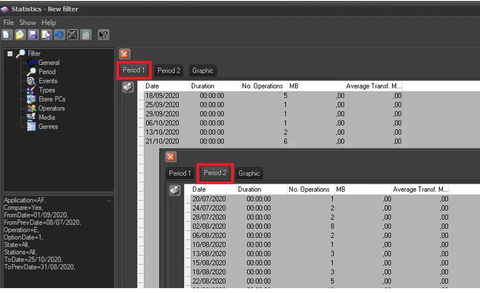 The Period1 and Period 2 will provide a list of the days on which the given filters are matched, each item of the list will indicate the data, duration, number, MB and Average MB/s of all matching operations within the period as well as the total number of operations and total transferred bytes: