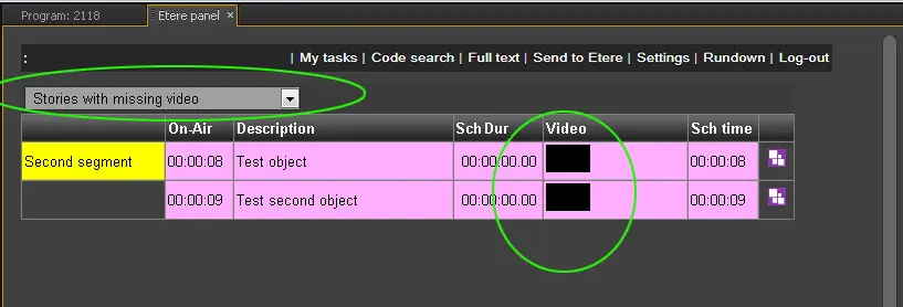 a) Stories with missing video (default): Rundown stories already linked to assets and featuring video objects: