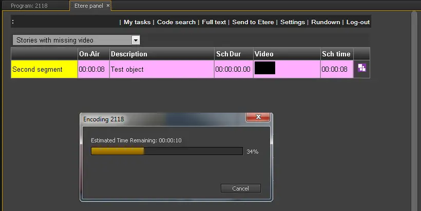 The [Send] button will be displayed for all stories with missing video, allowing to automatically encode the current sequence and upload it to Etere (as described in the "Send to Etere" chapter):