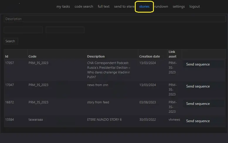 When stories matched the search criteria are displayed, if the story does not have an associated metafile linked to it, the Send sequence button would appeared in line with the story where you can import the metafile into the story.