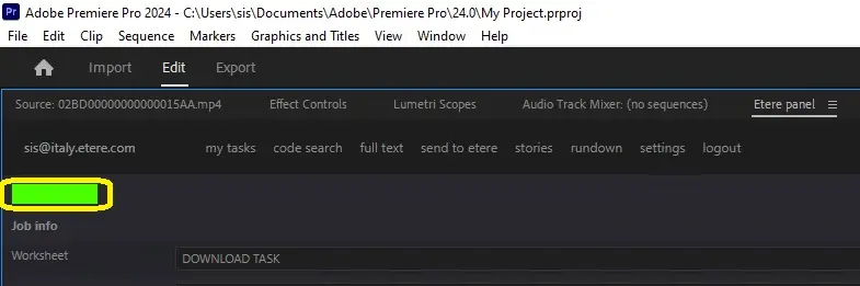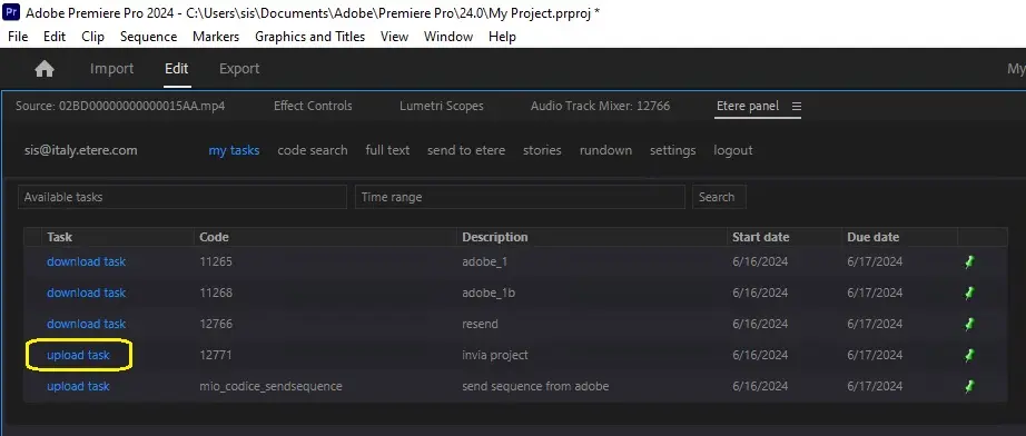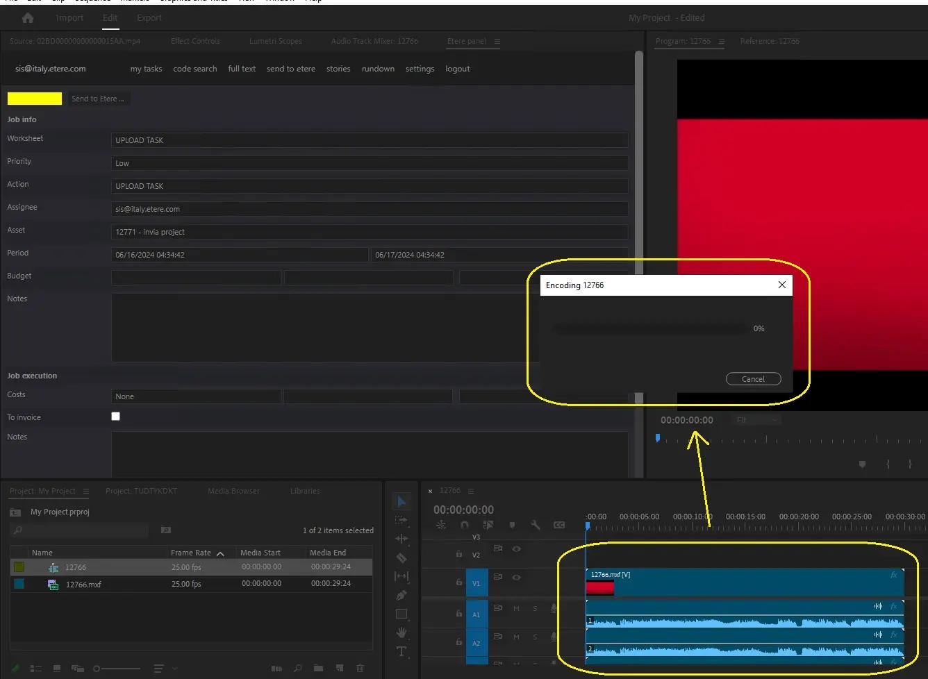 3.The status will become yellow indicating that the task was undertaken, you will be able to uploaded the edited media by pressing the [Send to Etere...] button: