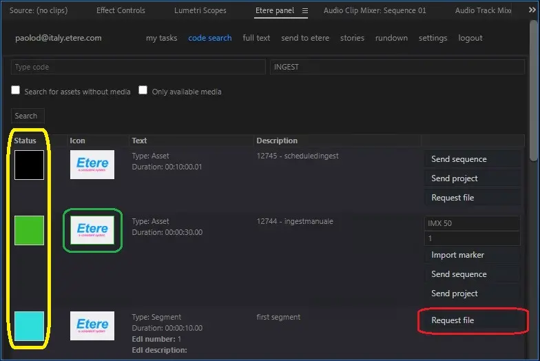 Under the "Search" section, editors can search for assets in the Etere MAM system and, depending on their status, they can import, upload or preview media and contents.
