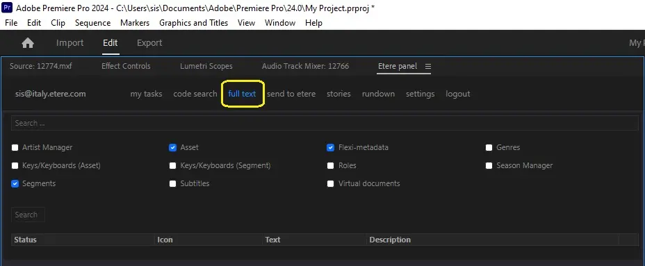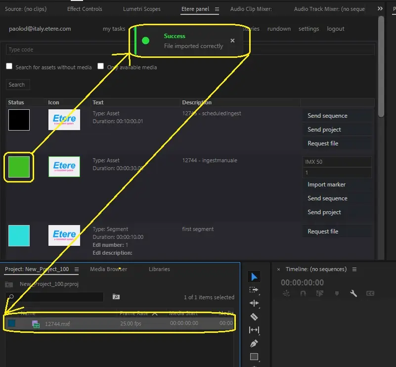 Send sequence or Send project buttons allow to export from Adobe to Etere the timeline (sequence) or the list of all media of the project (project). Any marker created in the Adobe timeline will be exported to Etere if they have a description filled (mandatory).
