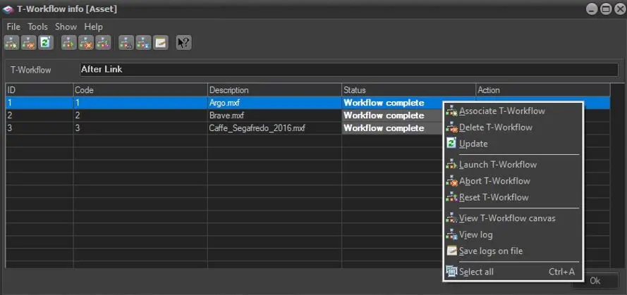 It will allow to manage all T-workflows for the selected assets (whether they are associated to it or not).