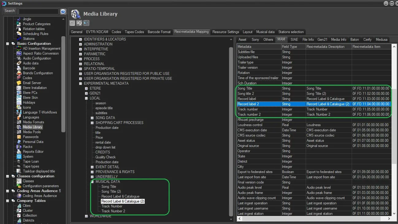 Flexi-metadata fields can be linked to MAM details (music details) under the Etere Configuration module, under the "Configuration > Settings > Basic > Media Library > Flexi-metadata > MAM" section. First create the flexi and then mapped them following the picture