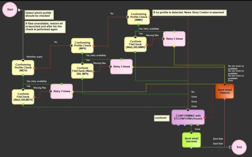 Still in the "Etere Configuration > Configuration Editor > T-Workflow > Designer" module, create a new T-workflow (e.g. MM - Conforming) and add the following actions: