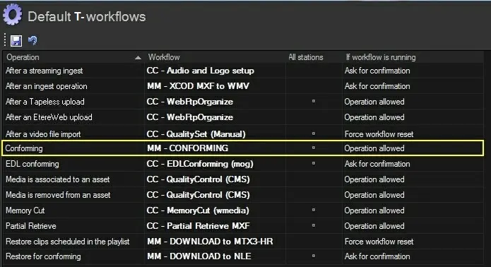 In order to allow the automatic execution of the "conforming" T-workflow (by the "version conforming" T-workflow), it's required to go to "Etere Configuration > Configuration Editor > T-Workflow > Default T-workflows" and set the "conforming" T-workflow as the one to be used by default for conforming:
