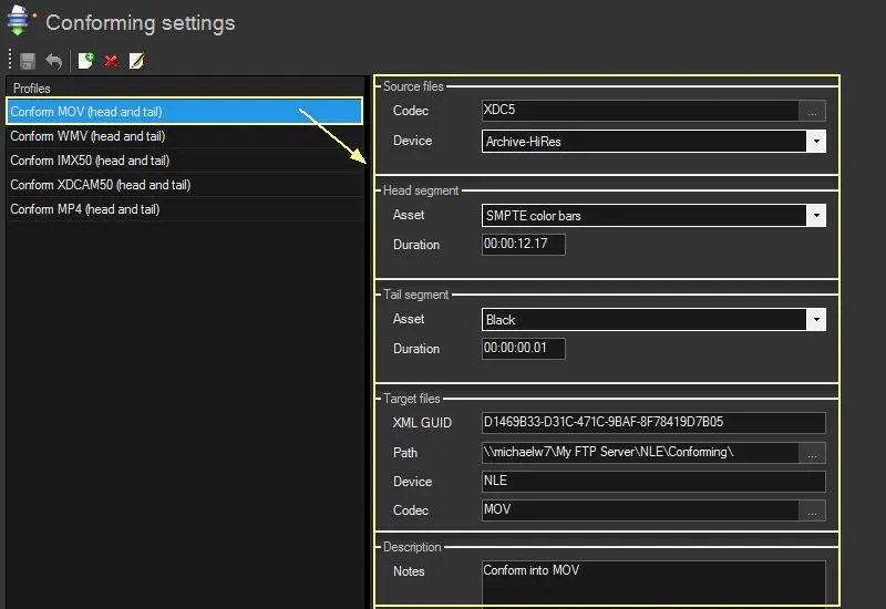 Open the "Etere Configuration > Configuration Editor > Conforming > Conforming settings" module and set the profile to be used for the conforming, that is, the codec to be conformed, the cloud-device from which take files, the head/tail assets to be appended, the Rhozet profile to use and the path on which place conformed files: