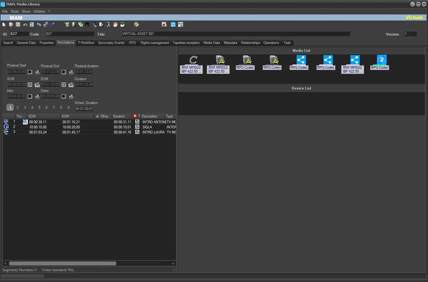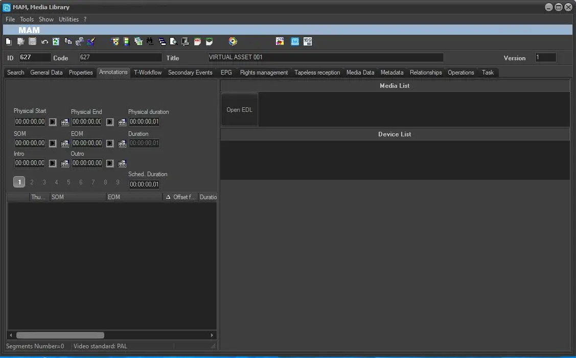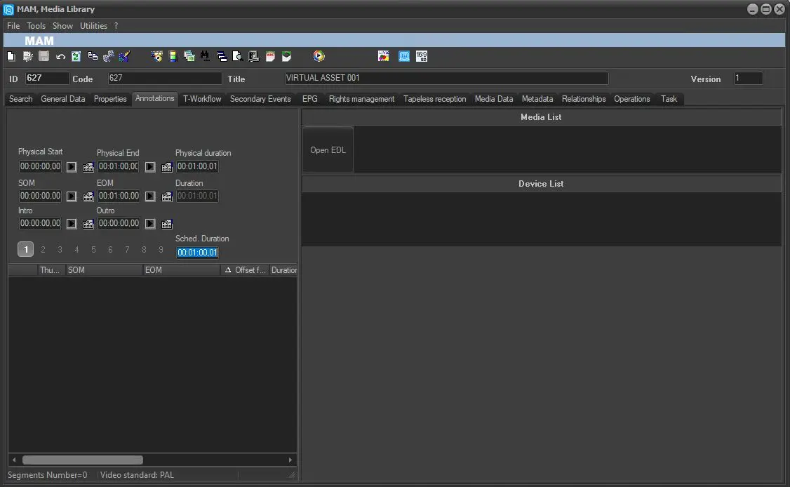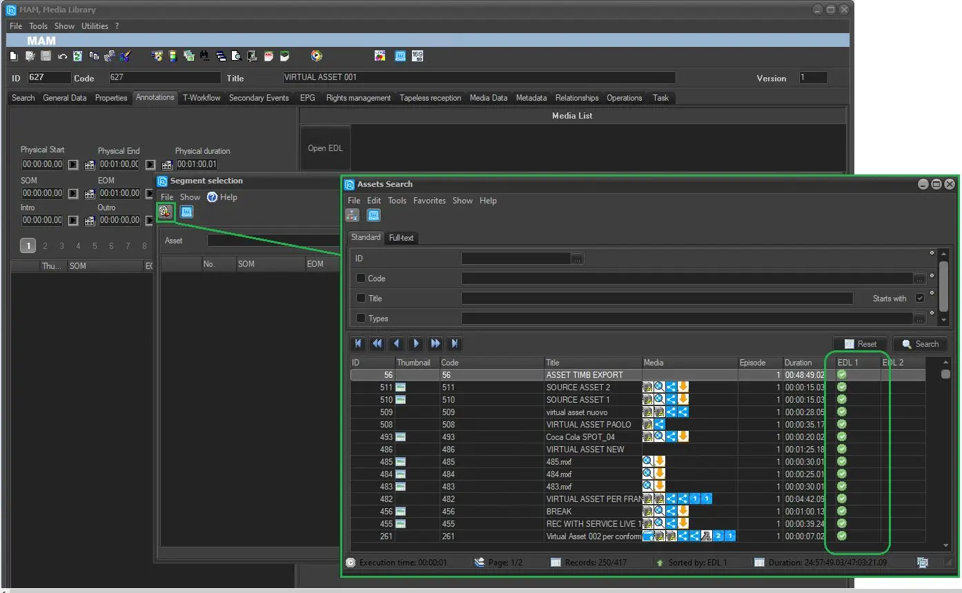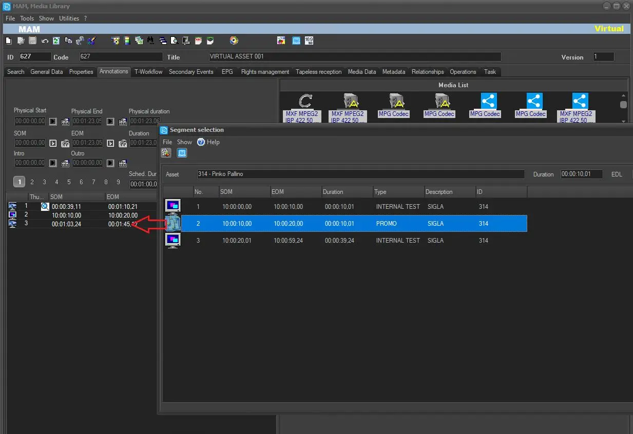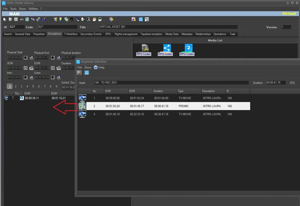 4. Press the ASSET icon and search for any asset with an EDL and segments inside it. Then, when you have chosen the correct asset, double click on it and it will be displayed exploded in the window below. Finally, select the correct segment to import into the virtual asset and double click on it with the left and this will be inserted into the virtual asset just created. NB: VIRTUAL ASSET will appear at the top right