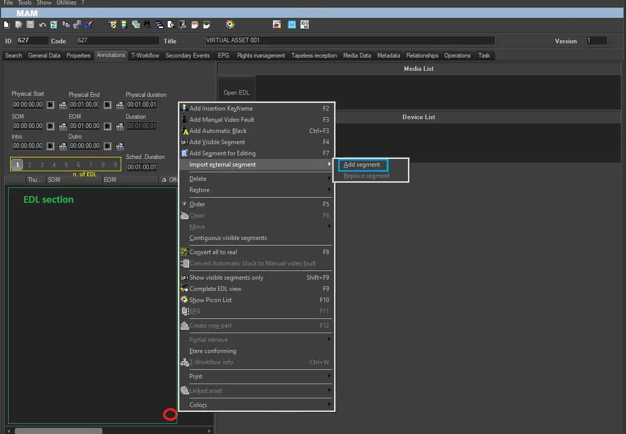 3. Go on EDL section selecting the correct number of EDL that you need to modify then click with right key of the mouse in an empty space of this form then select Import external segments – add segment.
