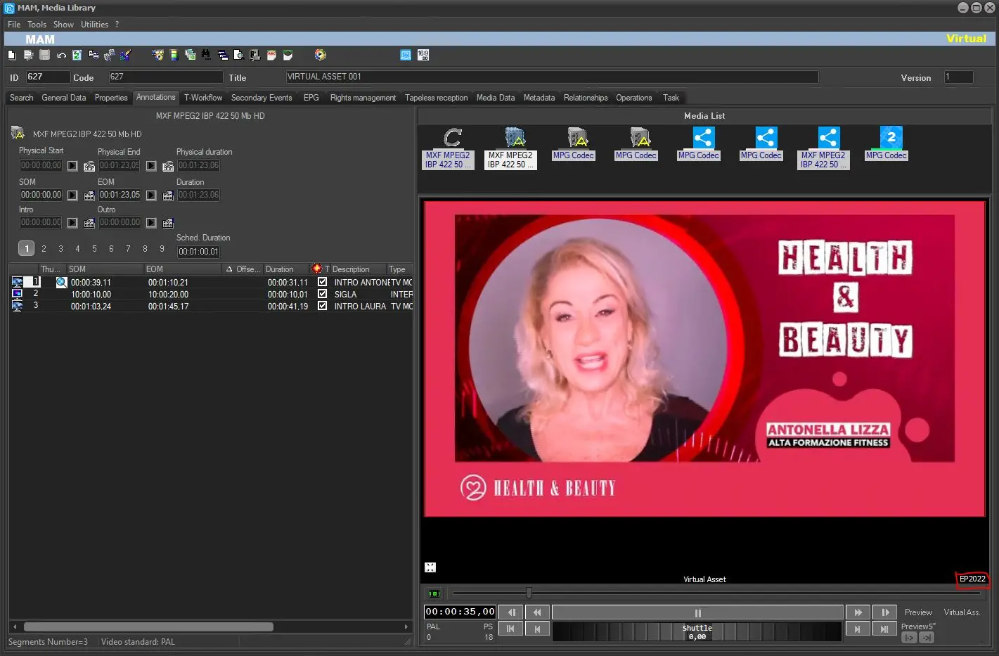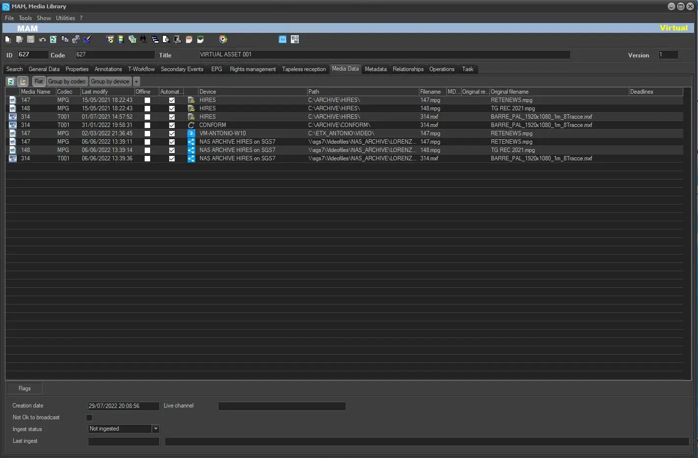The same Virtual Asset can be previewed in Etere MAM but it must have the lowres version linked to it with the default lowres codec.