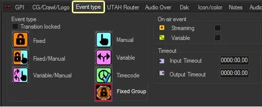 Timecode - The event will have a timecode duration, that is, it will be aired from its SOM (mark in) to its EOM (mark out) timecode. It's worth mentioning that this type is set for almost all events.