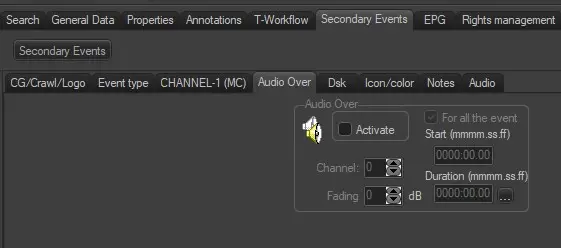 2. Specify the channel (if the value is 0, no audio channel is overlapped) and identify whether the audio over is for the entire event or from a specific start time for a specific duration,