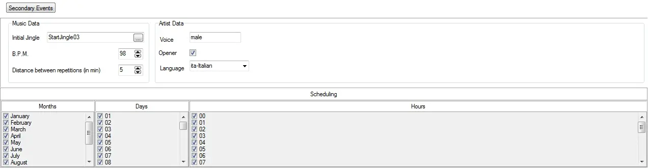 Set here the "secondary events" that will be displayed along with the primary event (i.e. the scheduled asset) as well as its "scheduling" allowances and "music" information.