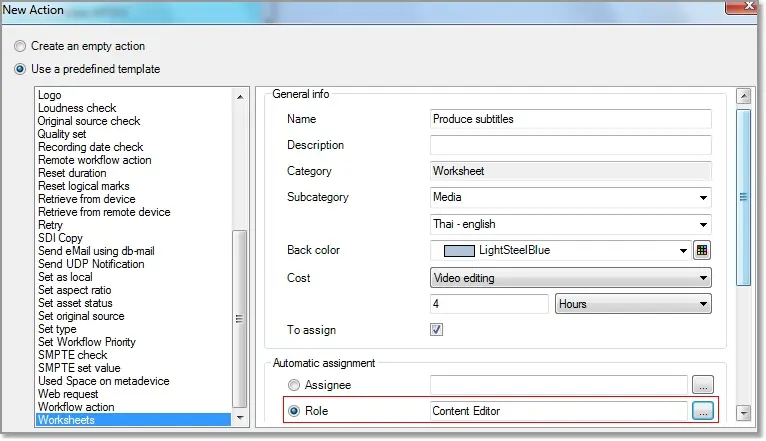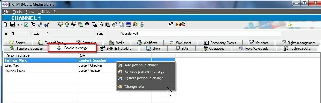 For example, the "people in charge" related to assets are used to automatically assign worksheets to operators according to the role they play for specific assets. For instance, thanks to the information set here, it is possible to automatically give a "subtitling" worksheet to all the "content editors" related to assets: