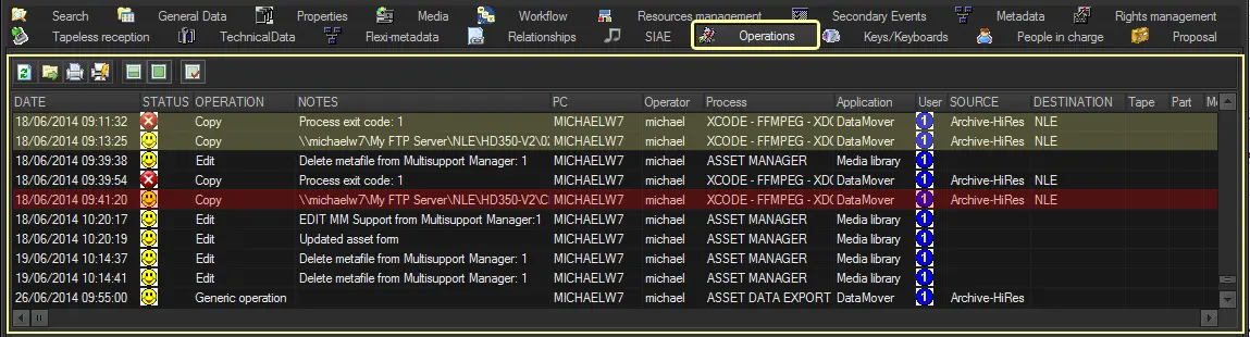Application: This column display the application used to trigger the operations, e.g. Data Mover action, Media Library function, or Web indicating a tapeless upload from EtereWeb, etc.