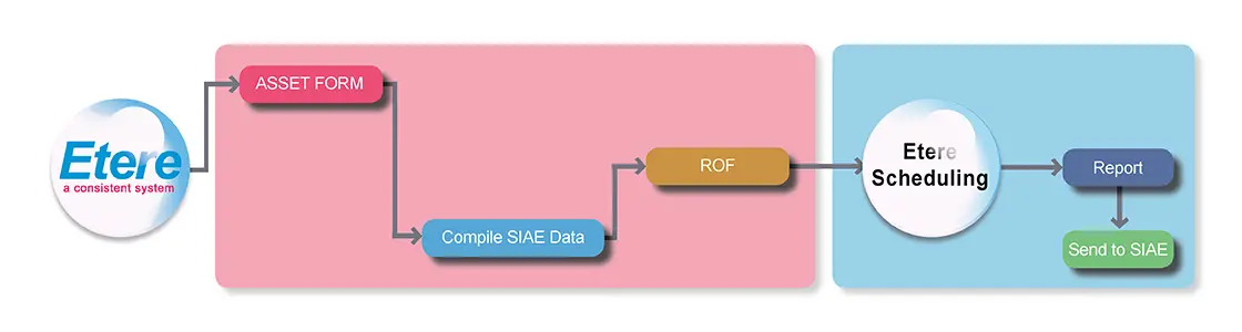 Etere, through its Media Library module allows operators to compile copyrighted asset information, this information is crucial for the elaboration of reports about transmitted ROF assets liable for taxation to be electronically sent to the SIAE society in a format according to the SIAE specifications.