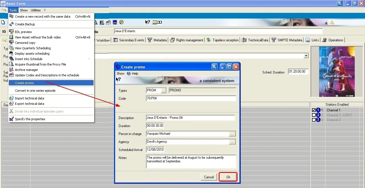 •Tapeless: Specify the person in charge of receiving the asset as well as the agency that will deliver at a certain scheduled date (using Etere Tapeless Reception).