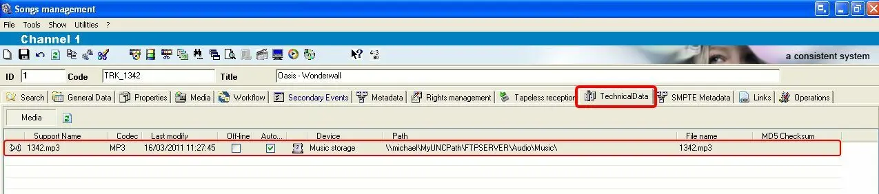 The technical-data tab allows viewing and editing all media files associated to a certain asset form, being possible to modify the media data (e.g.: codec, filename, metadevice, storage path, etc) as well as the asset data (e.g.: broadcast flag, recording status, etc):