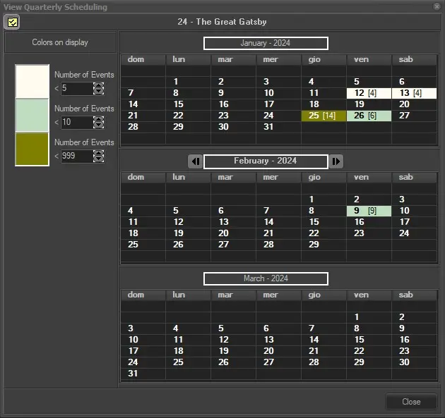 The schedule days where the asset is programmed are highlighted with colors according to the number of events, as the legend shows on the left of the window.