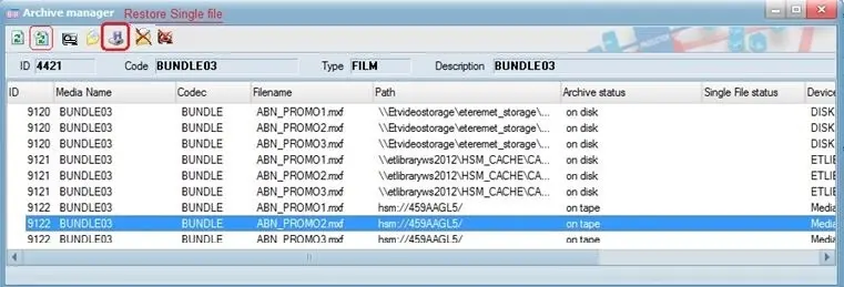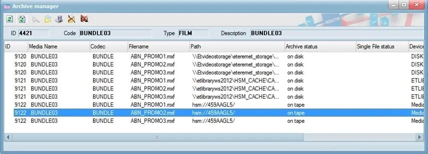 The Archive Manager tool shows all the media files (HiRes and Proxy) associated with the current asset, which are stored on disks. Selecting one of the files and clicking on the relevant icon in the toolbar allows you to:
