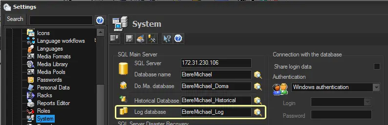 1. Under the "Etere Configuration > Settings > Basic > System" section, in the "Log database" parameter, enter the name of the database to be used and press the [Search] button to select/create the database: