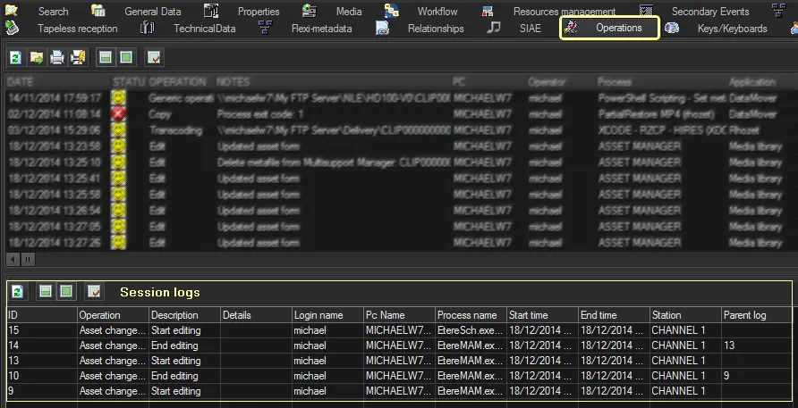 The recording of session logs covers all changes performed to the asset data including general data, properties, EDL, etc.