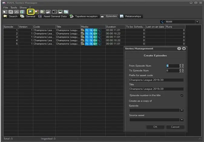 Once the [Ok] button is pressed, for every episode, a new asset form will be automatically created according to the previously described parameters.