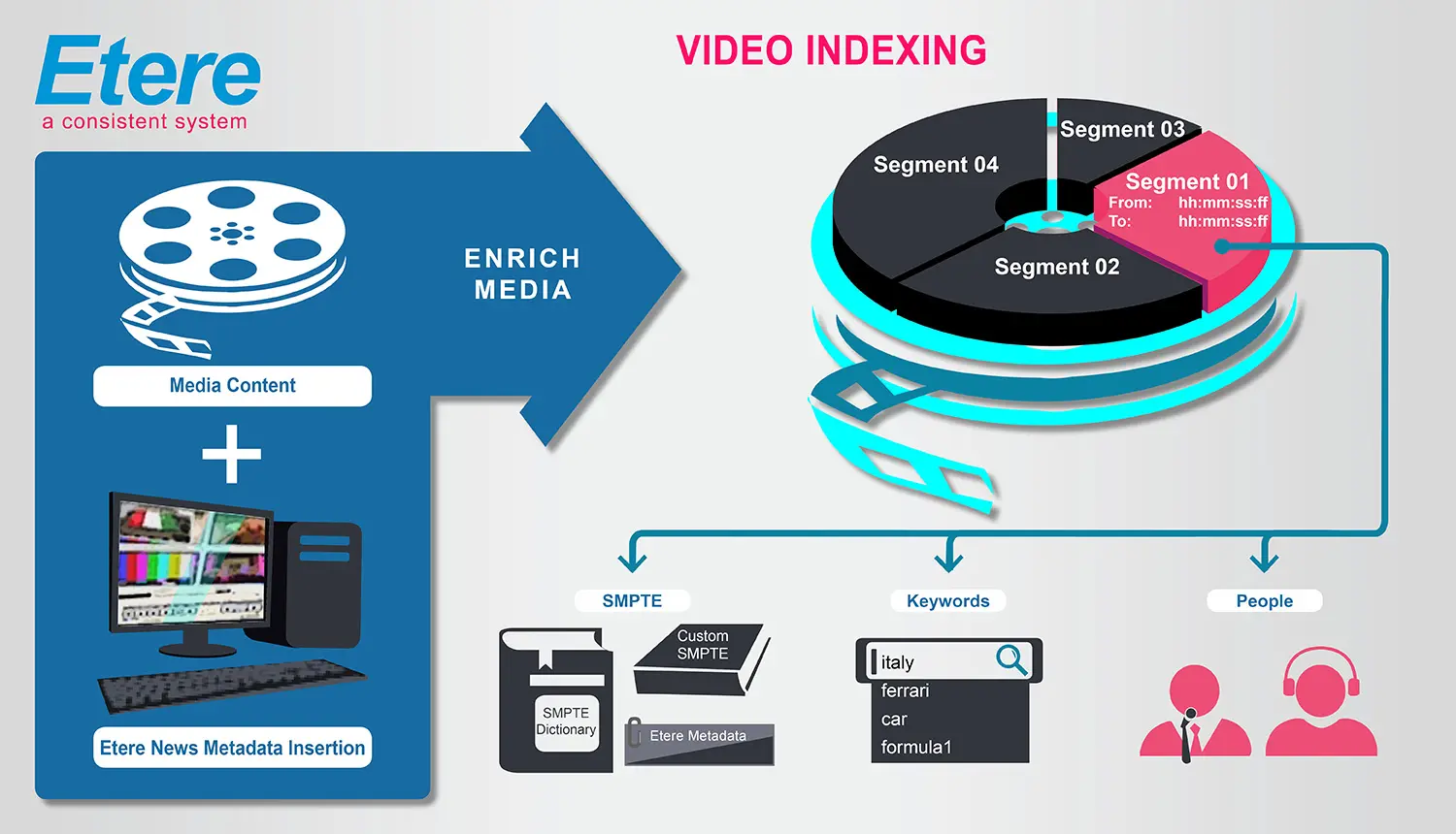 Etere allows authorized users to enter metadata either before ingest (into a placeholder created for a expected asset) or after ingest (to validate pre-entered metadata, modify metadata or add more metadata) while browsing a low or high resolution material. Moreover, automatic entering of metadata is also supported during ingest (importing descriptive XML files delivered along with video files).