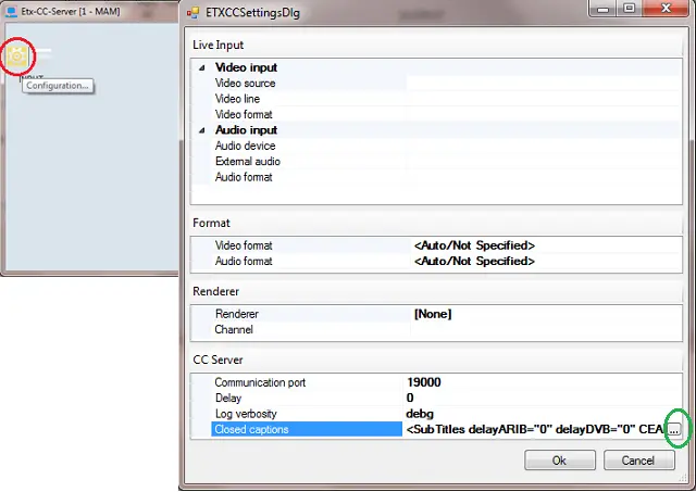 To configure the closed captions standards to be used in closed captions inserter, launch the “ETX-CC-Server” from the workstation and click on the “Configuration” icon to open the Setting dialog.