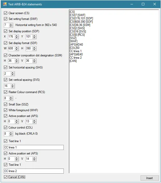When all commands / parameters are configured and confirmed, click the <Insert> button to insert the updated list of ARIB statements into the ARIB B24 transport stream.