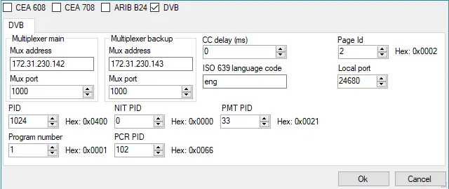 NB: For DVB subtitles, it does not support “Roll Up” and “Paint On” closed captions style in Live Subtitling, only “Pop On” style is available. To display DVB subtitles, capture the UDP transport stream in CC server and save output file as “.ts” format, open the “.ts” file with VLC and select DVB subtitles to view the closed captions.