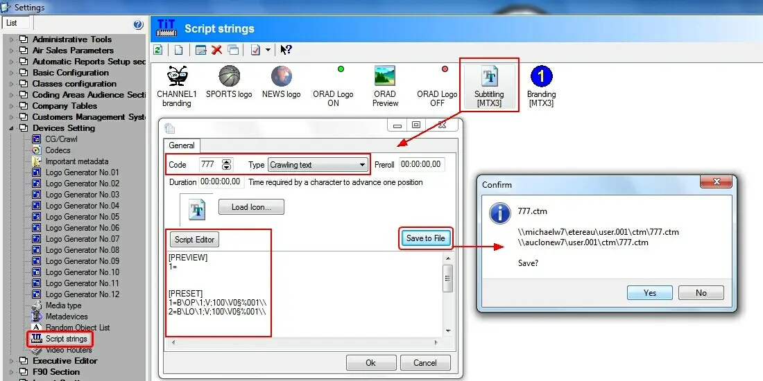 In case of using a ETX to automatically display subtitles for broadcasting events it will be necessary to configure the Crawl and Script to be used for sending subtitles to the ETX Logo, the configuration procedure is described below: