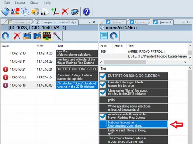 As you can see from the above screenshot, subtitles submitted to Closed Captions server are displayed on left panel, on the right panel it displayed all pre-prepared subtitles where the current subtitles focal point is highlighted in a blue box as indicated above.