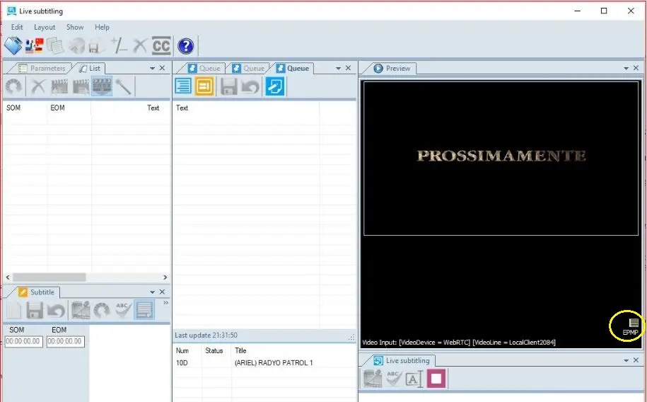 When Live Subtitling is initially launched, it present a black screen in Preview. You must click on the “EPMP” icon and define a video resource as Video Input and save the configuration.