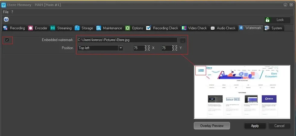 Overlay Preview: By click on this button, you can setup the embed watermark feature in real-time preview.